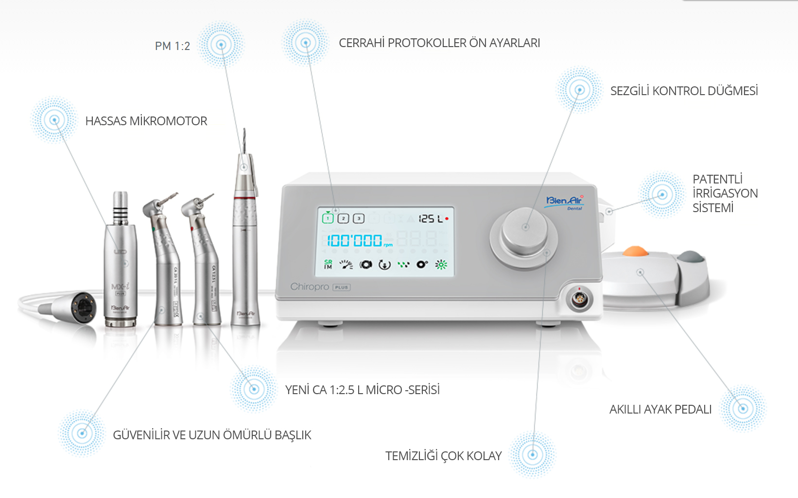 Basitlik. Bien-Air Dental tarafından geliştirilen yeni implant motorunun temel taşıdır. Diş hekimi veya deneyimli bir cerrah olarak, implant diş hekimliği prosedürleriniz için hızlı, basit ve verimli bir çözüm mü arıyorsunuz? Chiropro size sunulan çözümdür. İmplantların hassas ve düzgün yerleştirilmesi için size büyük bir yardım sağlar.