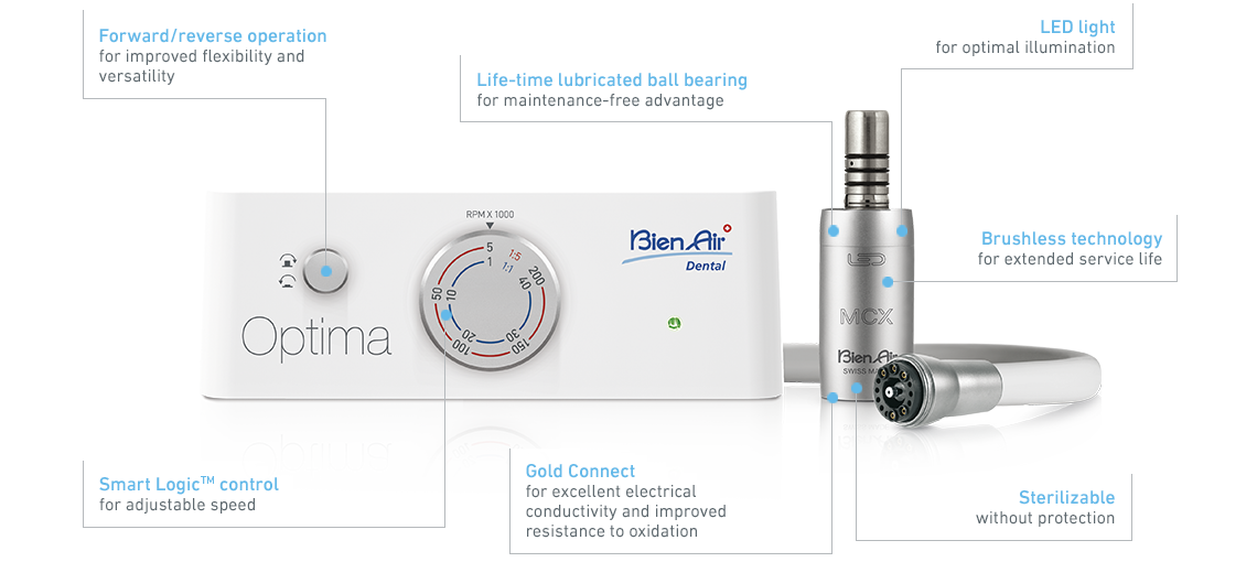 IOptima, performans artırıcı teknolojileri karmaşık olmayan bir deneyime sorunsuz bir şekilde entegre ederek pratik üretkenlikte yeni zirvelere ulaşır. Bien-Air’in en çok satan fırçasız mikromotorları ve sınıfındaki diğer retro-fit sistemlerden daha fazla yenilikle donatılan iOptima, elektrik gücüyle çalışan diş hekimliğinin geleceği için zahmetsizce ilk sırayı alır. Bir sonraki seviyede çalışmanın nasıl bir şey olduğunu görün.