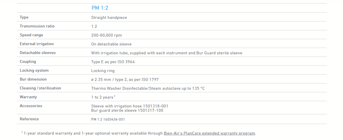 Oral maksillofasiyal cerrahide en çok satan PM 1: 2, Bien-Air’ın İsviçre hassasiyetinin tavizsiz kalite ve güvenilirliğe getirdiği şeyin özüdür. Yeni geliştirilmiş enfeksiyon kontrol özellikleri, bu düz başlığı hasta güvenliğinin ön saflarında konumlandırır ve karşılığında, önemli ölçüde daha uzun hizmet ömrü sağlar. Bien-Air’ın PM 1: 2 ile tüm belirsizlikleri güvenle ortadan kaldırın ve kendinizi aşmaya hazır olun.